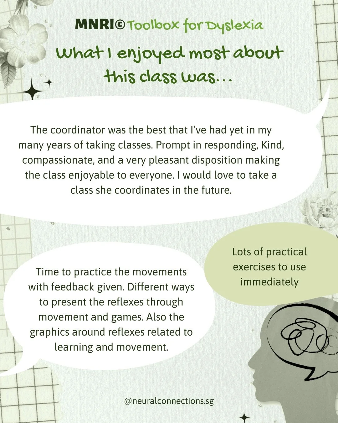 Neural Connections, founded by Hsiao Bond, is passionate about seeing families and children thrive. Specialising in the MNRI® (Masgutova Neurosensorimotor Reflex Integration) Method, we are THE centre to provide MNRI® treatment and MNRI® workshops in Singapore.