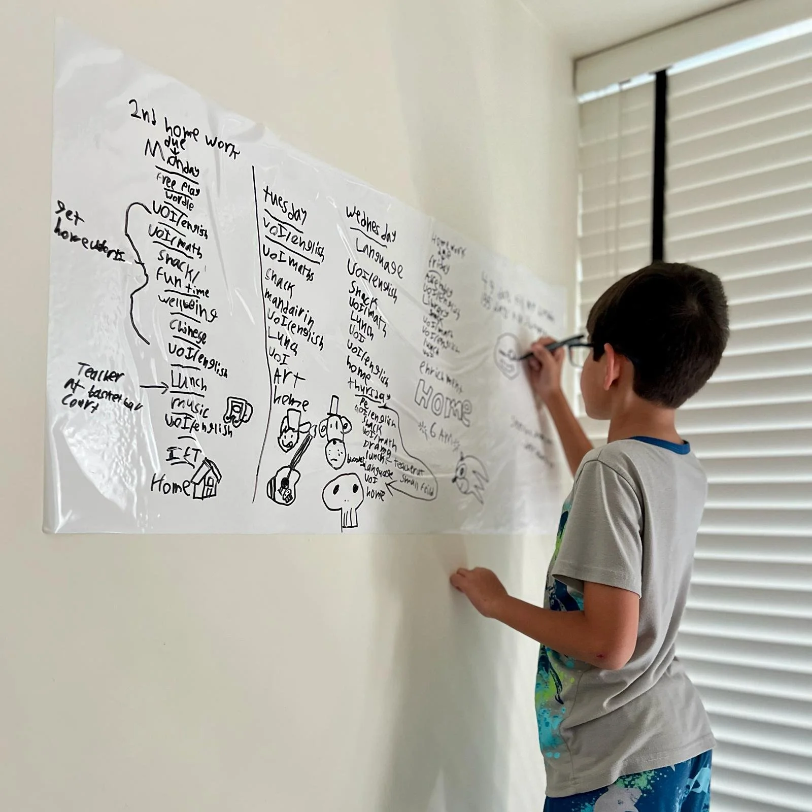 I walked into his room and found him writing his own school schedule on a whiteboard he had mounted himself. No prompting. No reminders. Then I noticed he had written “MNRI” under his sleep strategies for when he has trouble sleeping.